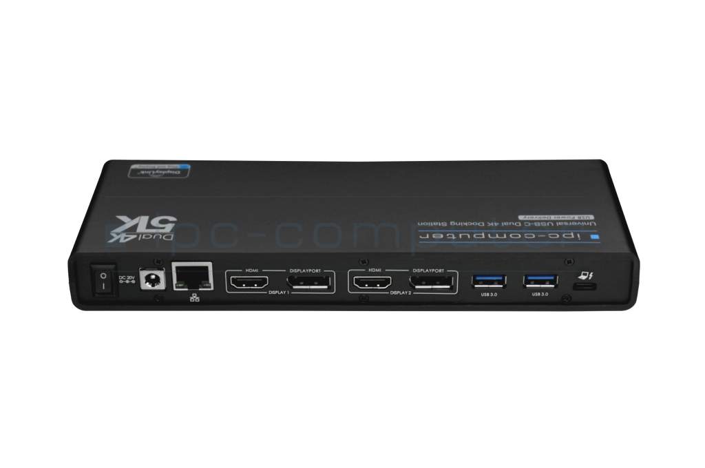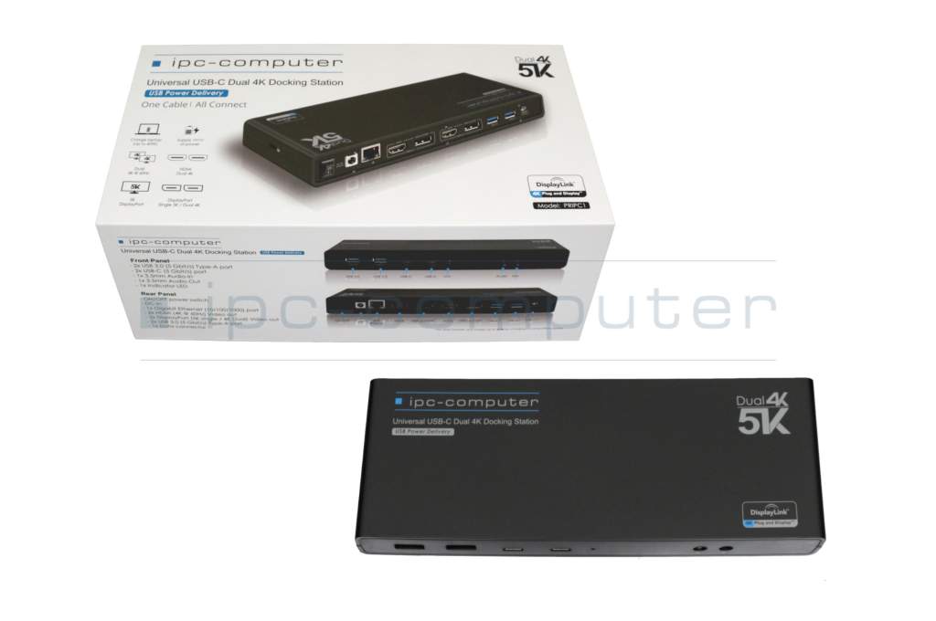 Bei den Spezifikationen kommt der PRIPC1 auch nicht zu kurz. Ein herausstechendes Merkmal ist die Unterstützung von bis zu zwei 4K/2K Monitoren. Alternativ unterstützt er auch den Anschluss eines 5K Monitors. Die Bildwiederholungsfrequenz beträgt dabei flüssige 60Hz. Außerdem bietet er mit seinen zahlreichen Anschlüssen die Möglichkeit nach Belieben Zubehör anzuschließen. Der IPC Portreplikator besitzt 4 USB 3.0 Anschlüsse für Maus, Tastatur, Drucker und weitere Equipment. Seine zwei USB-C Anschlüsse vollenden die umfangreichen Anschlussmöglichkeiten.