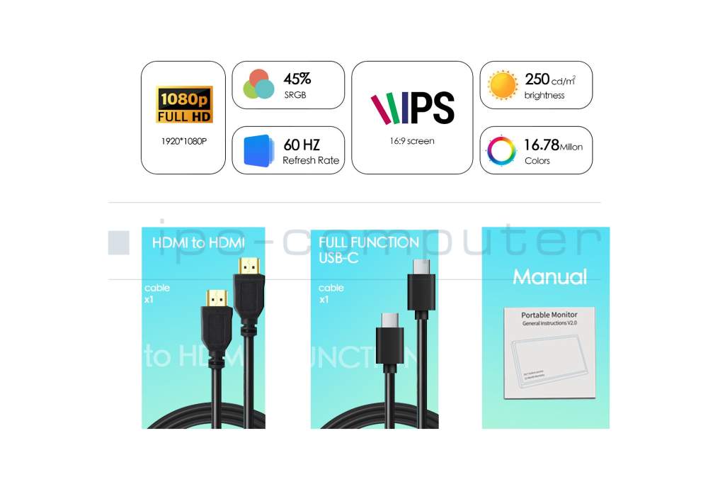 Entdecken Sie unseren portablen Monitor — die perfekte Lösung für alle, die Flexibilität und Leistung benötigen. Dieses portable Display ist ideal als Zweitscreen für Ihren Laptop, PC oder Mac und erweitert Ihren Arbeitsplatz, egal ob im Home-Office, auf Reisen oder unterwegs. Mit seinem ultra-dünnen und leichten Design ist er der ideale Reisebegleiter und passt problemlos in jede Laptoptasche.